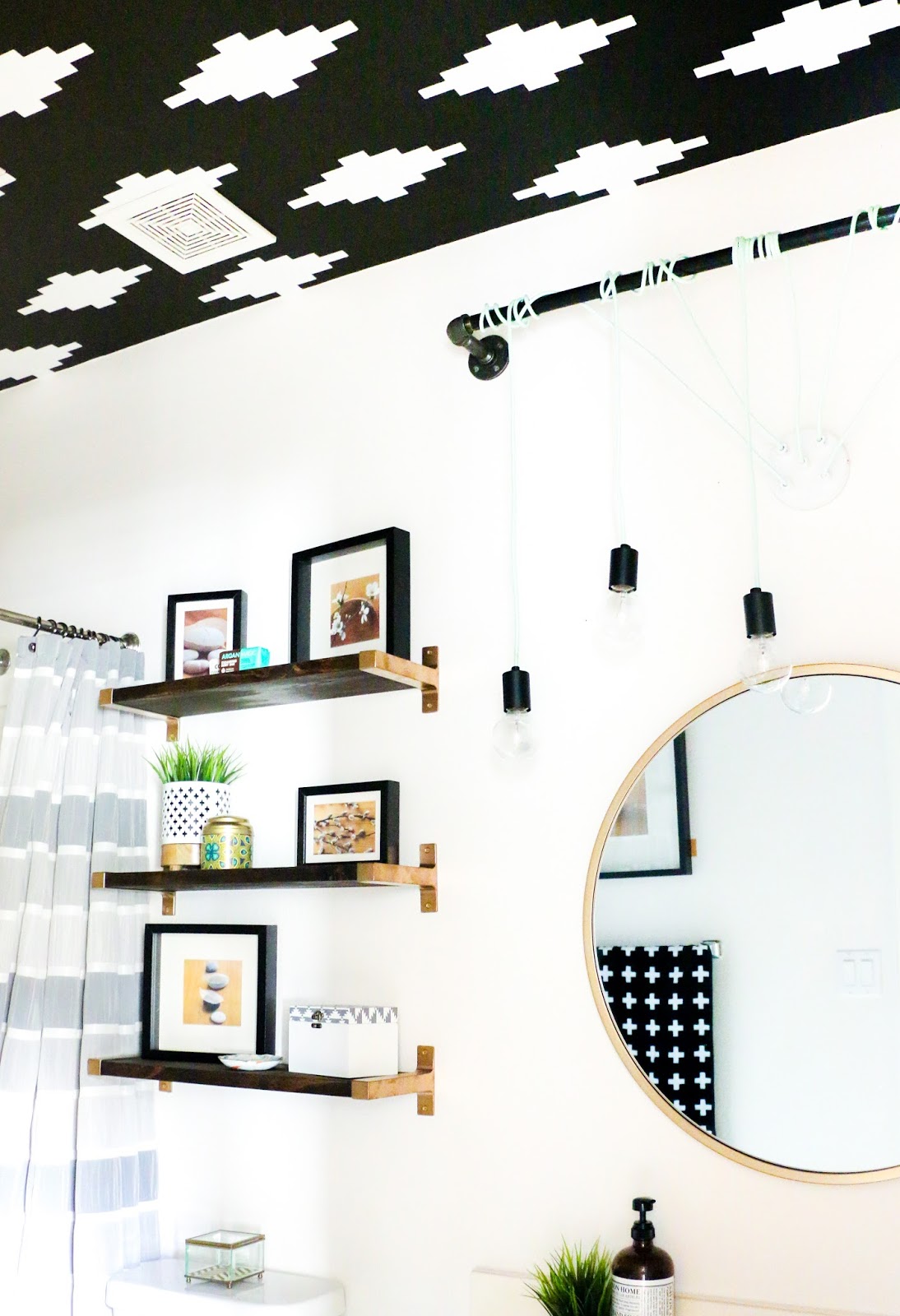 The space has no natural light and is very difficult to photograph, but trust me when I say that it was a total transformation from the bright yellow bathroom with builder grade mirror and light fixture that was there when we moved in. And that ceiling!