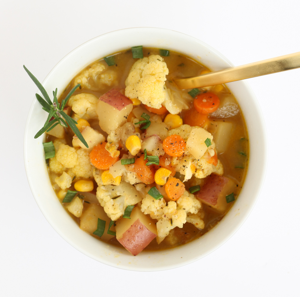 One of the top things that I love about the winter months is eating a warm, comforting bowl of soup. Nothing warms you up quite like it. I also love the ease of soups. For the most part is a one pot meal. Just throw in all your ingredients and let it simmer away until all the flavors meld into a glorious rich broth. One of my new favorite winter soups is my version of a winter vegetable soup. Full of cauliflower, red potatoes, carrots, and corn this soup is not only comforting, but good for you as well. Heck, it is pretty much the only way I can get my husband to eat cauliflower!