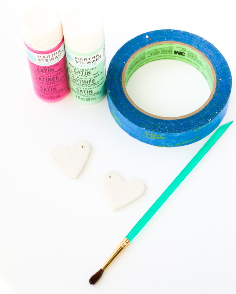 Begin by rolling a piece of air dry clay appx. 1/4 to 3/8″ thick. Then use your cookie cutter to cut out your heart shapes. Poke a small hole into the tops of the hearts using a pin, then set aside and let dry.