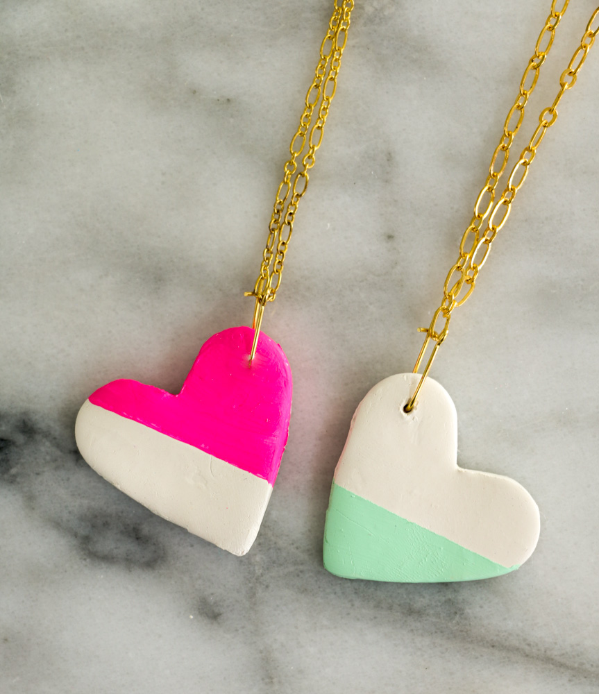 Once you have your final heart pieces, go ahead and use your pliers to add the jump rings through the holes in the clay hearts and add them to your necklace chain.