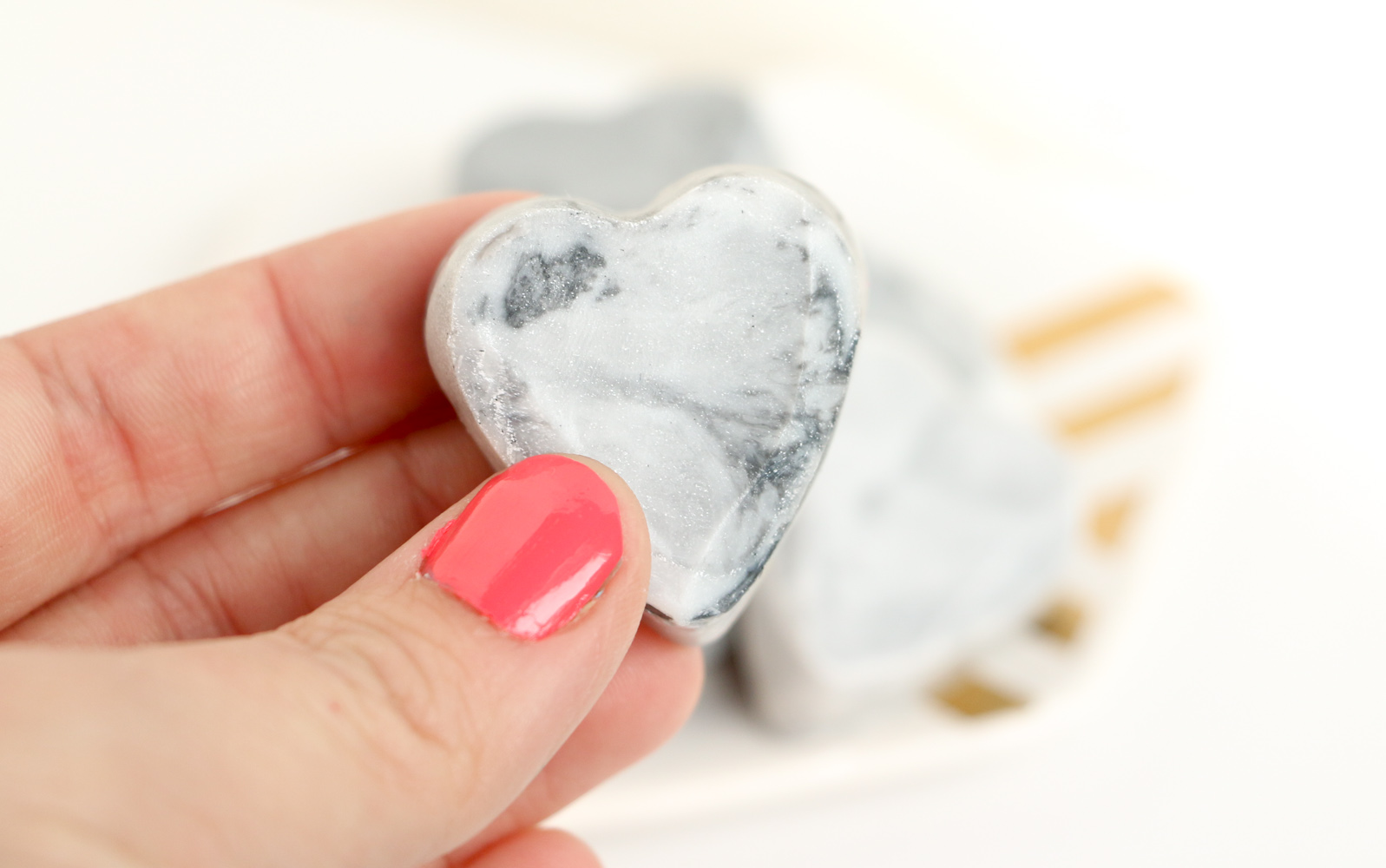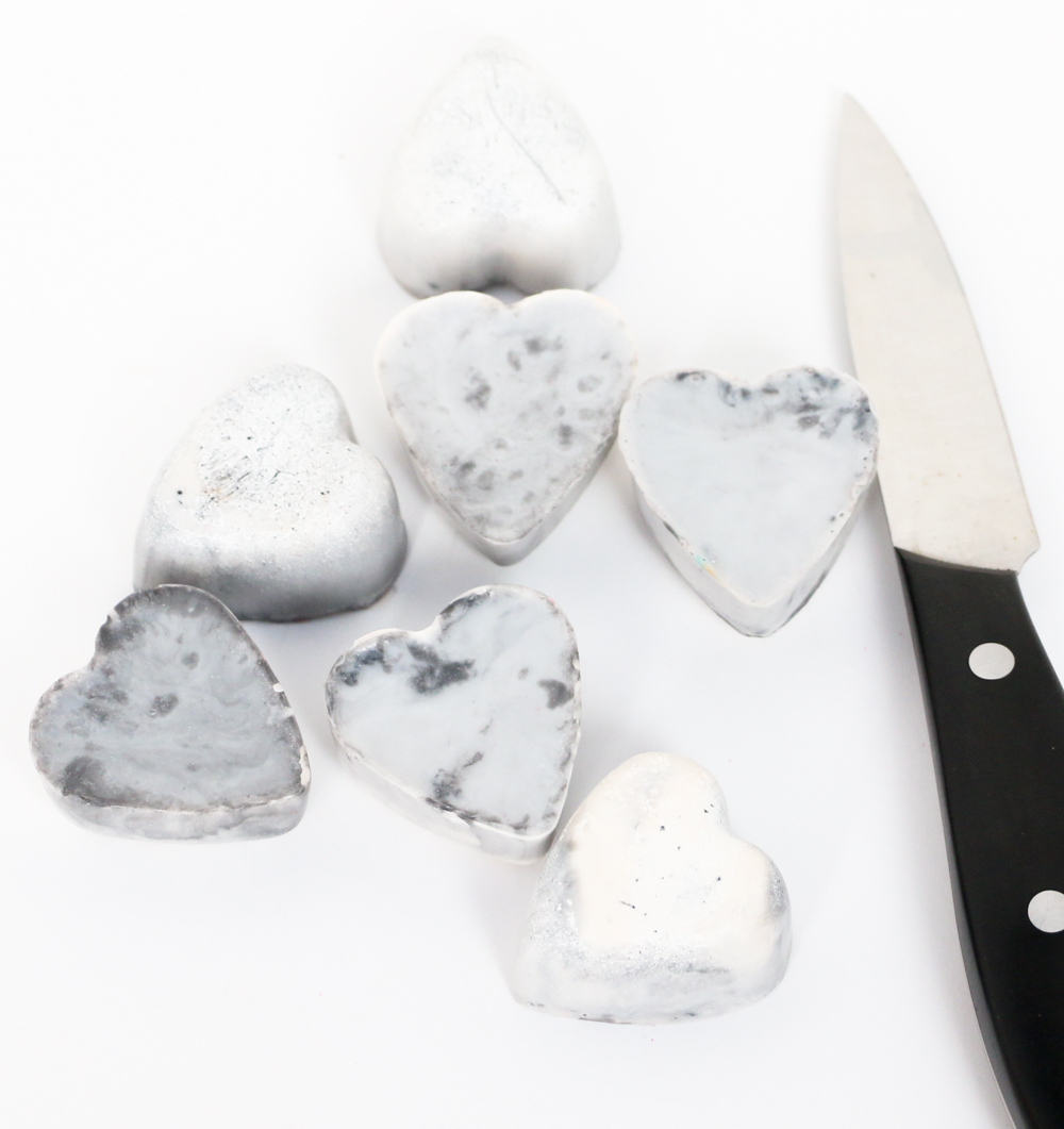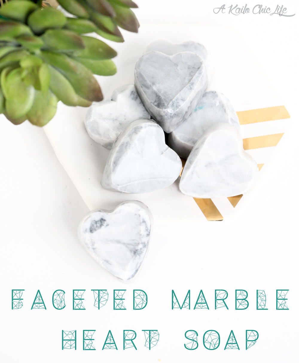 One of the projects that I was able to create this weekend are these super fun faceted marble heart soaps. Among all the other things I mentioned on Friday, the pretty black and gray veining of marble is another one of my inspirations of late. I decided to try my hand at some soap marbling just in time for Valentine’s Day and let me tell you, these little soaps turned out so amazing!