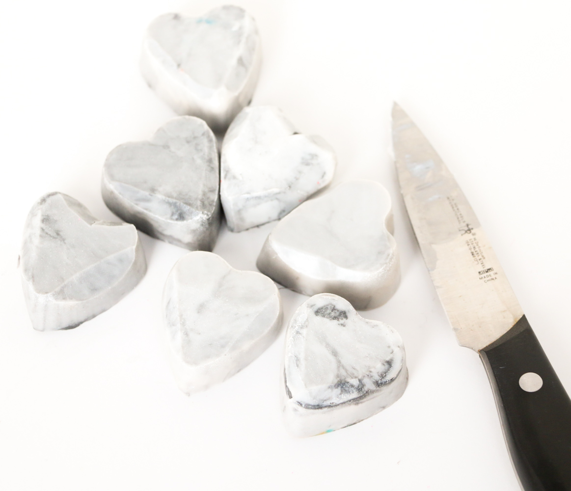 Now that you have your soaps, you can either leave them like this, or take a sharp (non-serrated) knife and gently and carefully cut the top face of the heart off and then slice little bits of the sides of the soap to create a faceted look. Cutting the soap like this will also expose the marbling inside the soap as well.