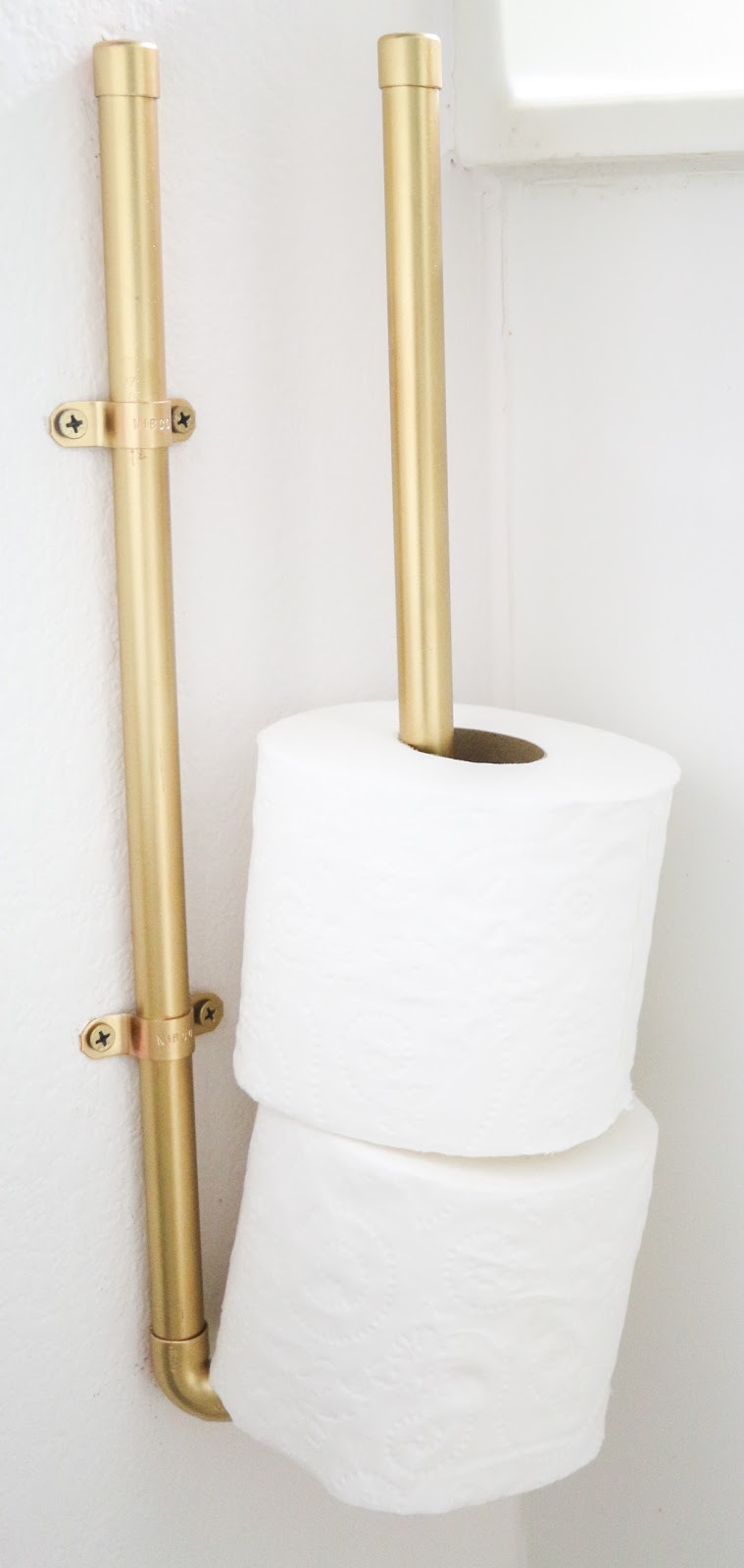 And since the spray painting of the copper pipe turned out so well, I decided to heed the advice of some of you and go ahead and spray paint the copper pipe toilet paper holders I made a few weeks ago. I used Krylon metallic gold for these and I love the light champagne gold color. It goes so much better with the mirror and shelves I already have up in my guest bathroom. Don’t you think?
