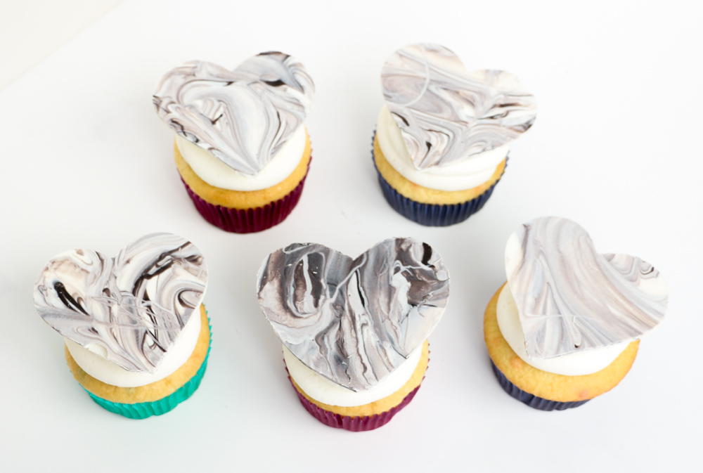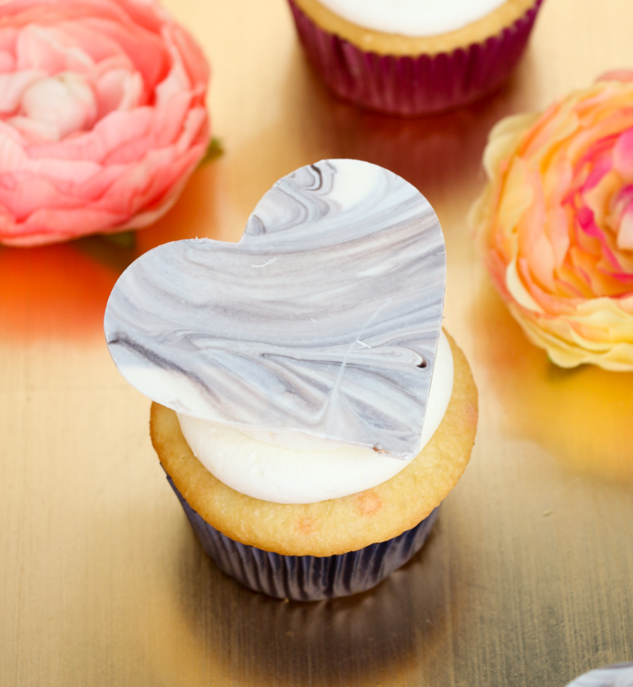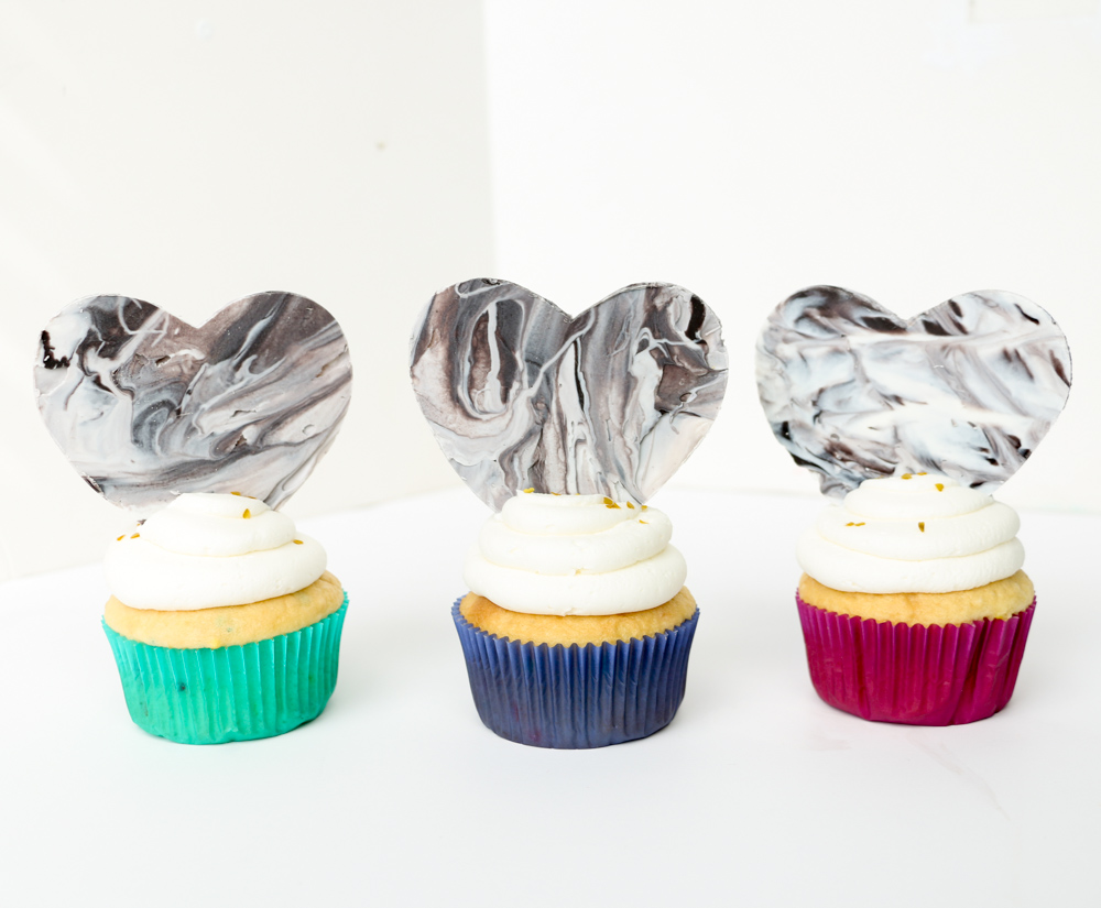I love the different marble texture that each heart has, and by using the acetate paper you get a nice shiny look to the coating chocolate so that it looks like real tempered chocolate hearts. The light gray marbled one on the single cupcake above is my favorite. Which one is yours?