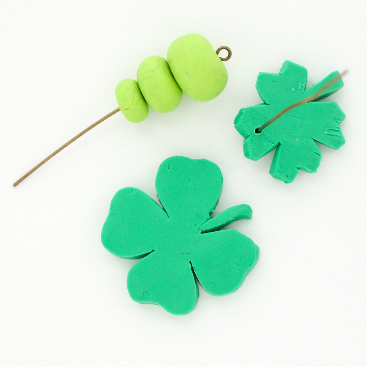 Place your template on your flattened clay disc and use your X-acto knife to cut around the clover (or free hand the heart shaped leaves and stem). Once you have your clover cut out, work the lighter green clay into three balls each a bit smaller than the previous. Slightly flatten them and then thread the beads one at a time onto one of your eye pins. You will also use a second eye pin to poke a hole in the clover.