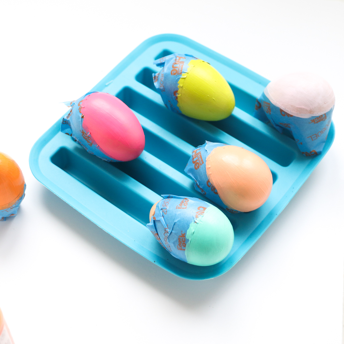 Begin by taping off the wood eggs with the painter’s tape in random patterns and directions. Then paint each one a different color (or the same color, depending on your preference) and lay out on a drying rack (or Ikea ice cube tray, you know what ever you have handy!) until dry. Some of the lighter colors might need a second coat.