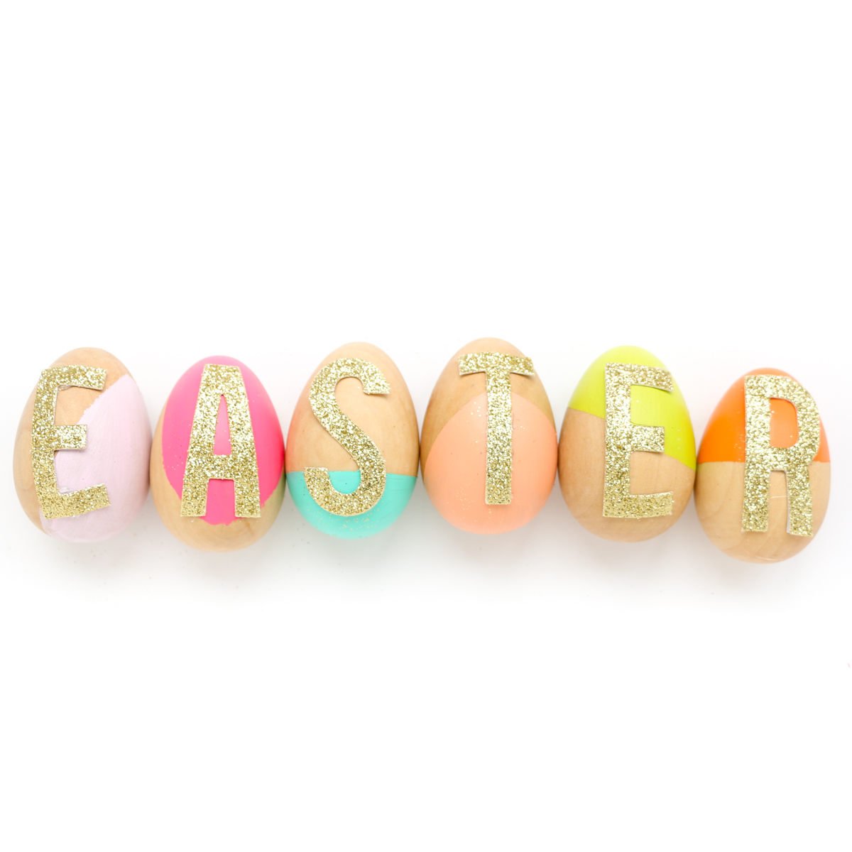 Okay, okay, enough of that. Now that you have your eggs painted, it is time to add your gold glitter stickers. This is pretty straight forward. Just use the letter of the first name of the dinner guest on the egg and that egg will go on their plate. Since I was just making these for fun, I spelled out EASTER which is another option if you don’t need place cards. Because these would make a pretty centerpiece too!