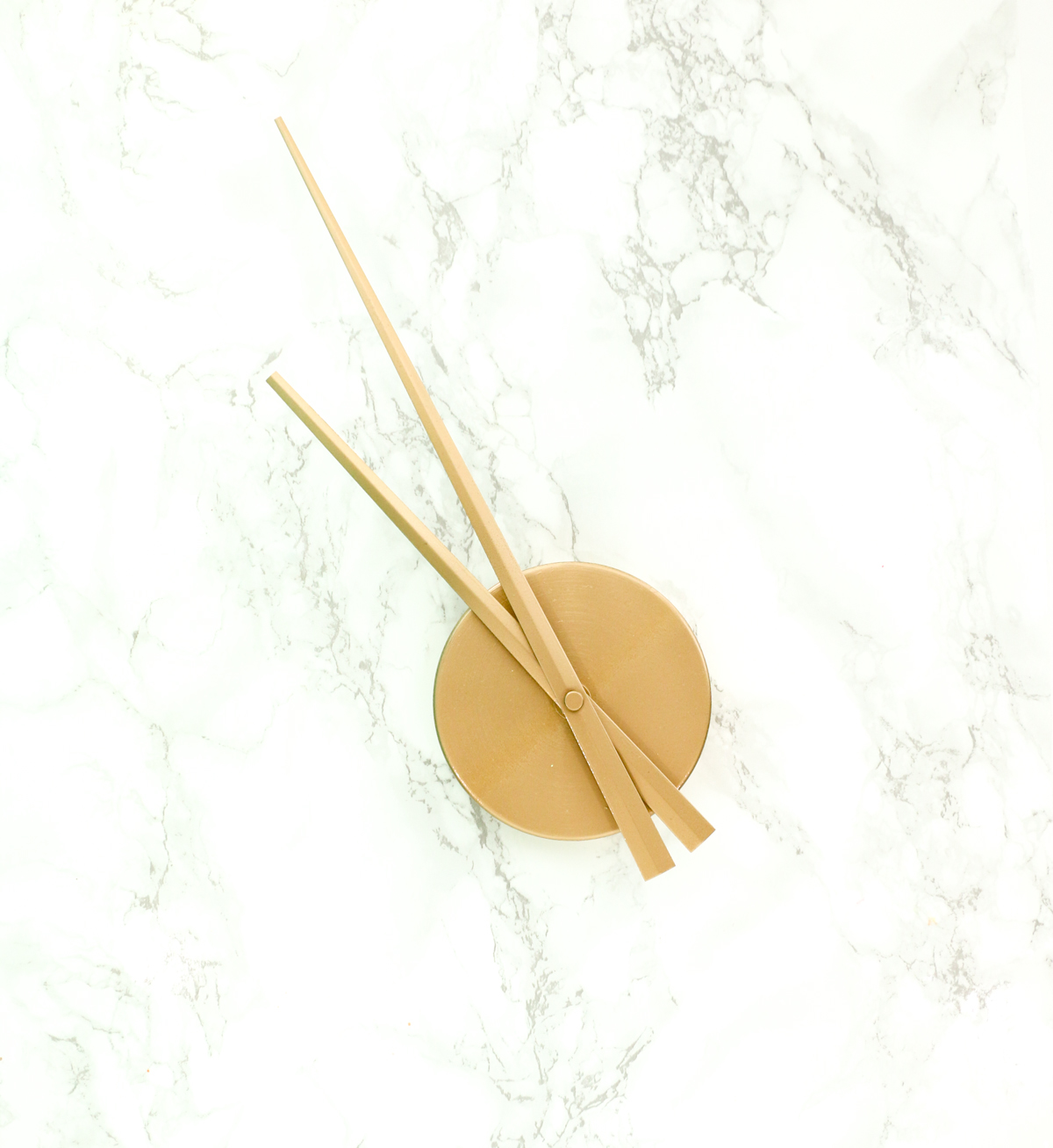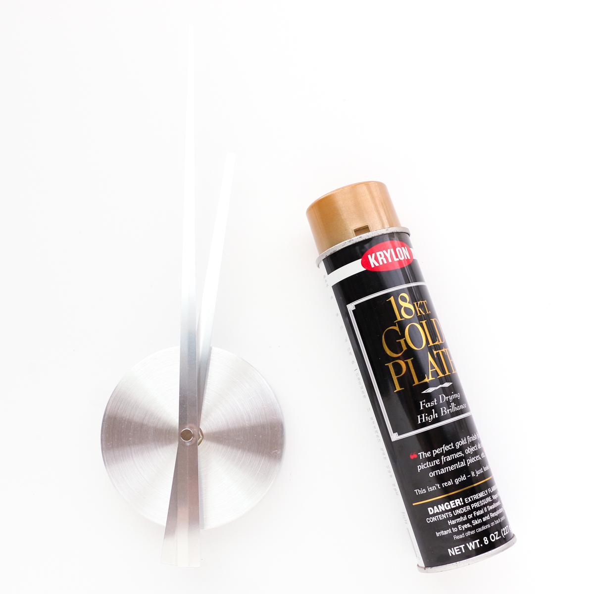 Begin by spray painting your clock movement gold if so desired. After my clock movement was painted gold, I sprayed it with a coat of shellac to help it maintain the fresh, fingerprint free surface.