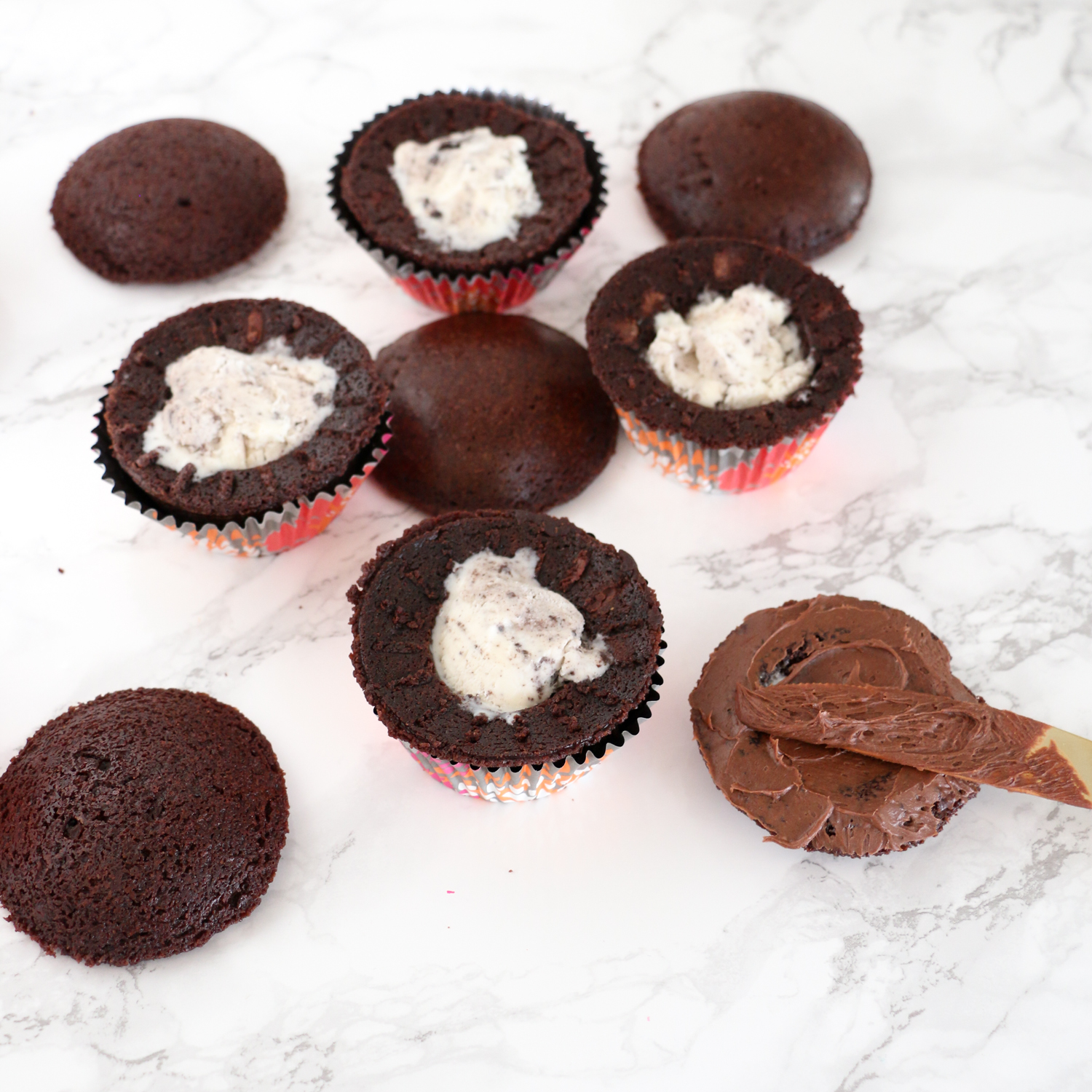 cream and use the chocolate frosting to secure the cupcake top onto the bottom.