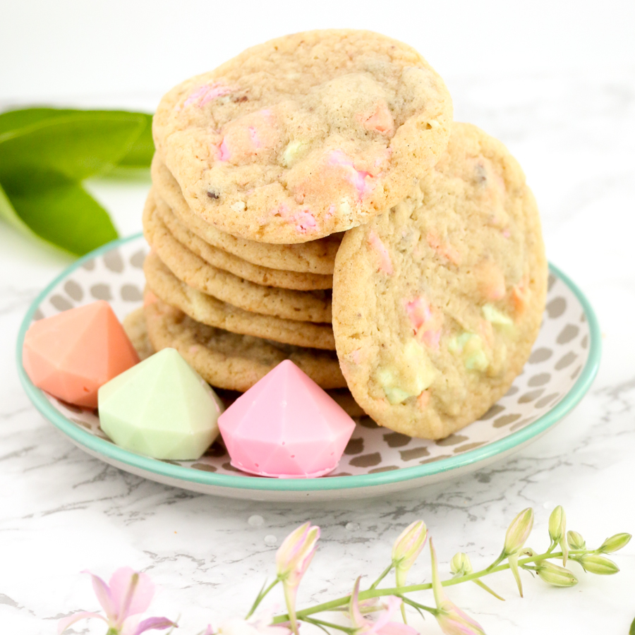 The cookie recipe I used is my go to chocolate chip cookie recipe that yields the most soft and chewy cookies and I simply just swapped traditional chocolate chips for chopped up colorful candy melts. Easy peasy.
