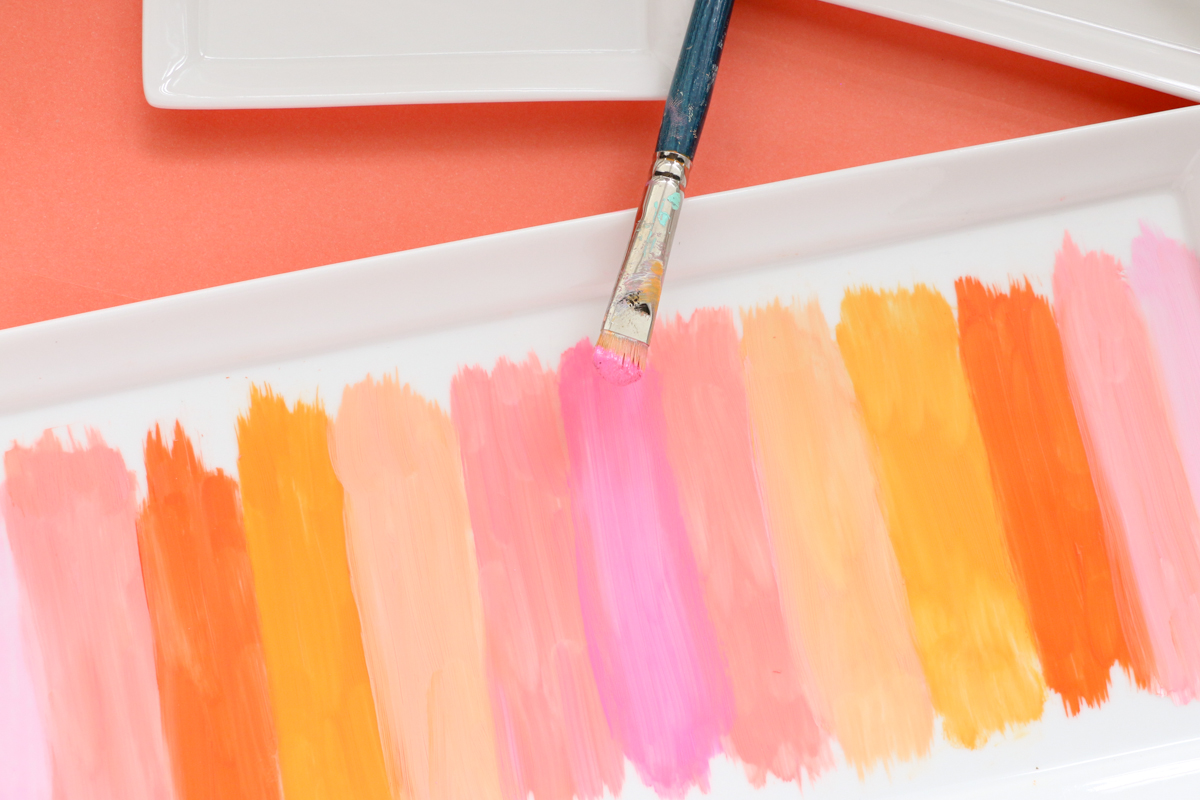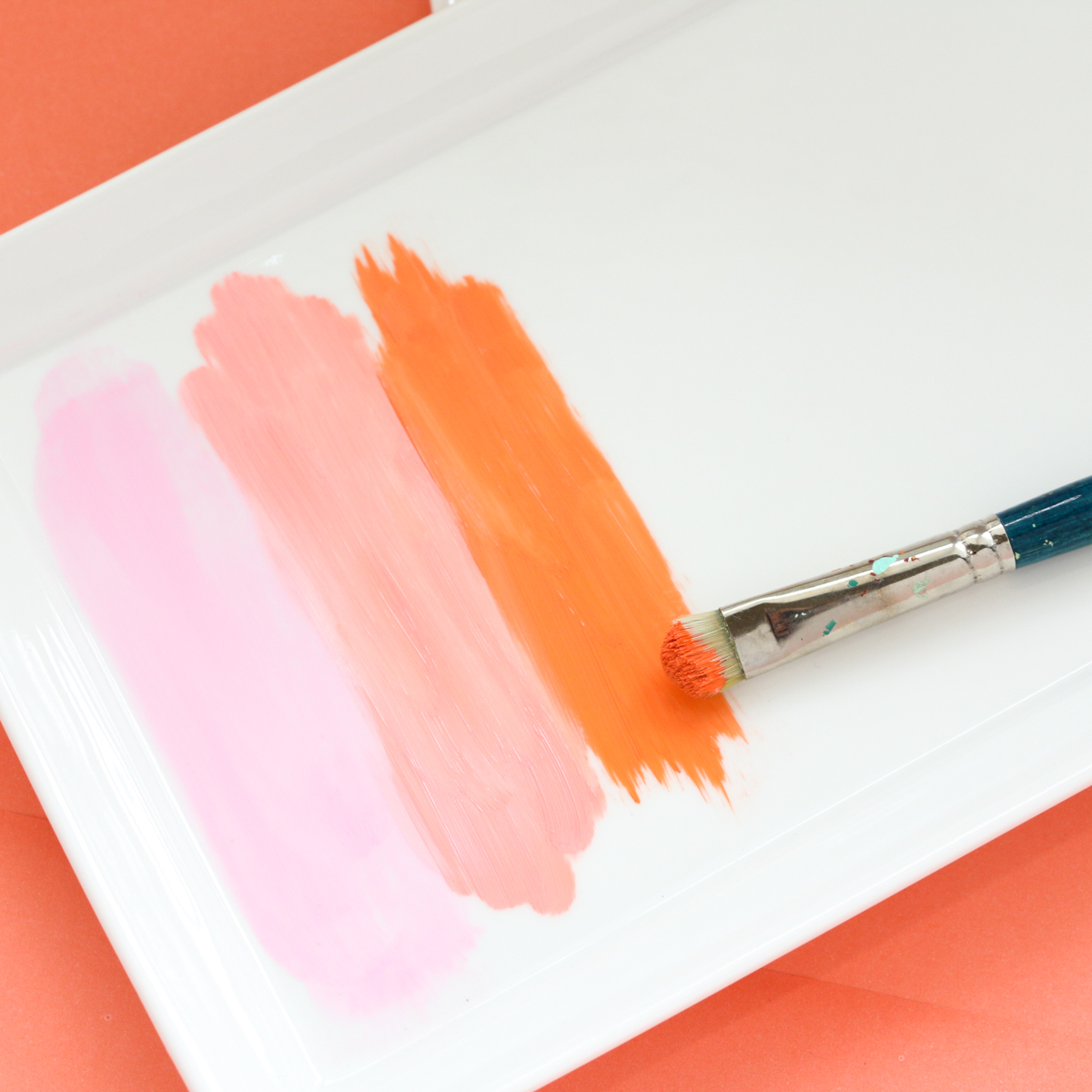 Start by mixing your paint to achieve several different shades of pink and orange. I did some plain pink, then light pink (pink and white paint), plain orange, light orange (orange and white), coral (pink and orange), light coral (pink, orange, and white), and a few other shades of blush by adding a bit more pink and white or orange and white to the light coral. Just pick a palate you’re excited about. There are no ‘wrong’ colors. You just want to make sure you have at least 6 or so colors to get a nice look.