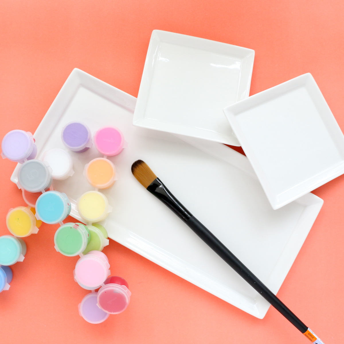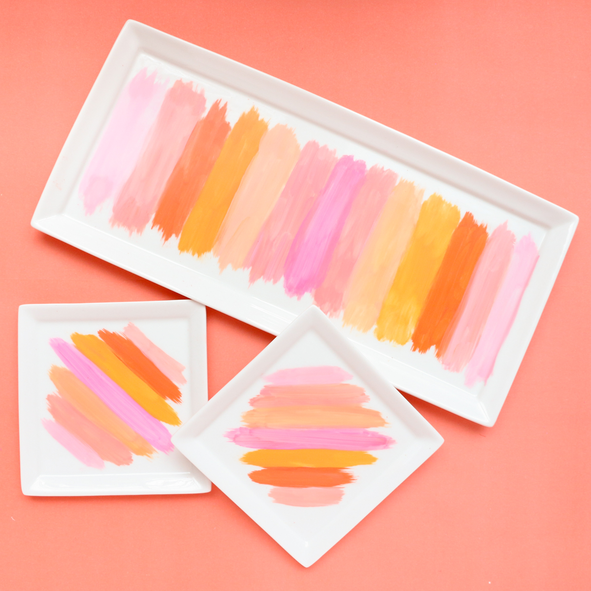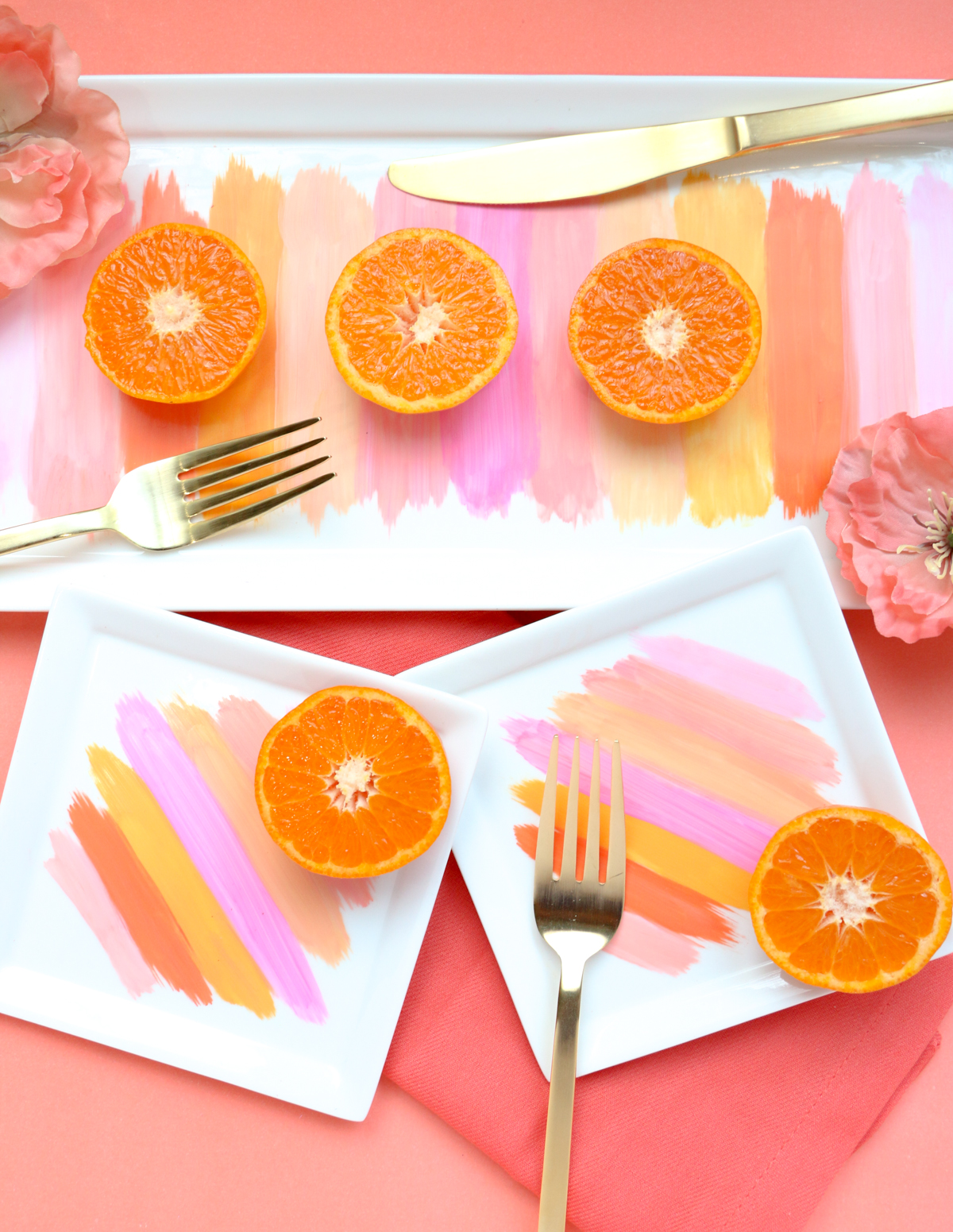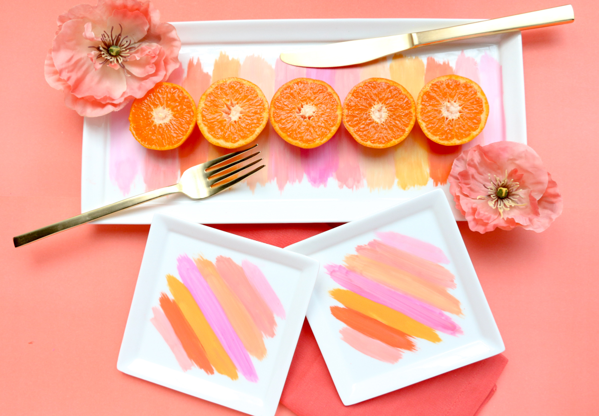 The paint I used was an oven cure paint that is non-toxic, and while it is probably fine to eat off of and is really well adhered (doesn’t scratch or flake), the package didn’t say anything about whether or not it is food safe. So use your own discretion on whether or not you want to use them with direct food contact. It can always be used as a ‘presentation’ plate. Or some cool wall decor. Or just with food like cupcakes with paper keeping a barrier between the food and the painted plate.