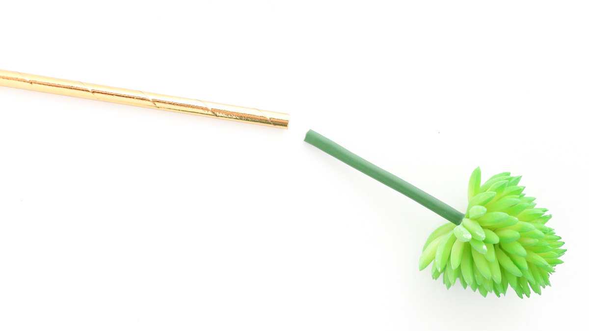Simply cut off 2-3″ from the straws to make them a bit shorter for cocktail glasses or leave them full size for regular pint glasses. Then simply slip the end of the faux succulent into the straws.