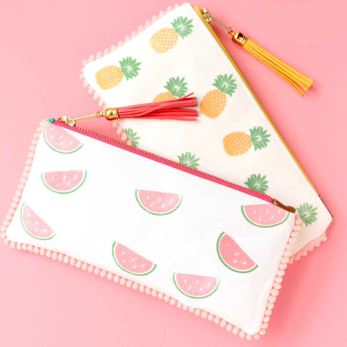 Aren’t they just perfect? And this pineapple pouch will be able to do double duty and work as my bag for the Palm Springs pool party that is happening at SNAP on Friday night! While I sewed these pouches, don’t worry if you don’t have the sewing skills to make your own zip pouches, because I have a solution for you!
