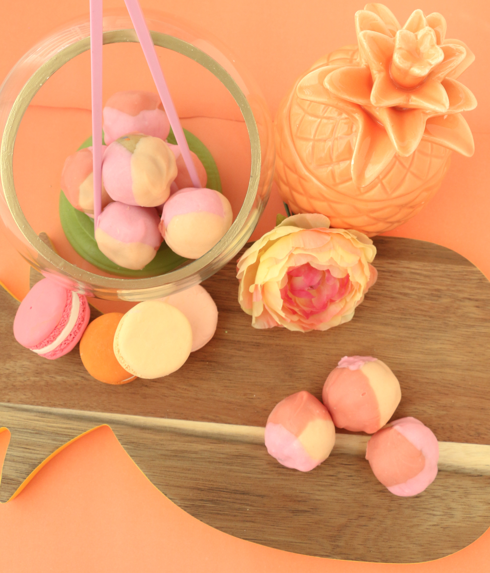 Once the chocolate has hardened, rewarm your melting chocolate and dip the other half of the truffle to create a two toned color block look. Then set them on the parchment tray again. I tried to do a triple color block look for mine, but they didn’t turn out as awesome as I would have liked. Next time I will take my own advice and just go for a two tone color block instead.