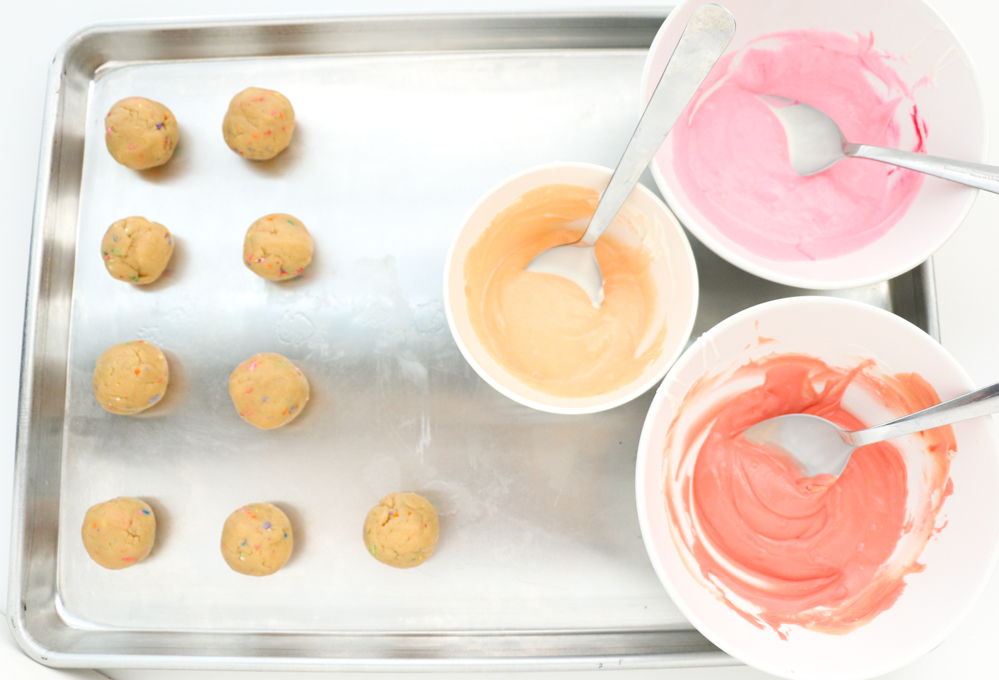 Add your sprinkles and pulse a few more times to really incorporate the sprinkles. Remove the dough from the food processor and roll into 3/4 inch balls. Then, melt your coating chocolate.