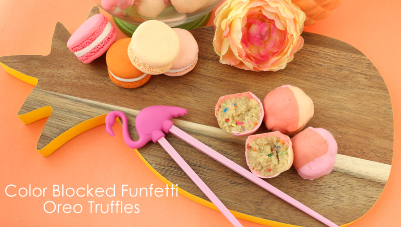 There’s something so fun about turning a regular dessert into a sprinkle-tastic, colorful, flavor-carnival. Cupcakes with sprinkles? Yes! Frozen yogurt with sprinkles? Yeeessss! They say you eat with your eyes first, and my eyes (and stomach) want color! Last week, I showed you how to make a funfetti s’mores cheeseball. Today, I want to show you how to up the color and sprinkle quotient on the staple Oreo-truffle.