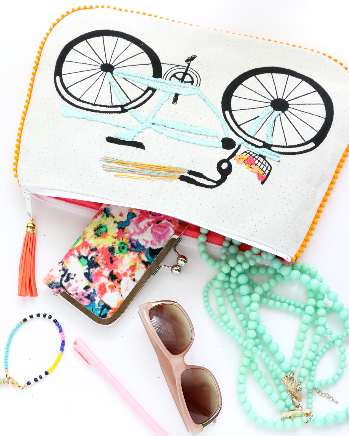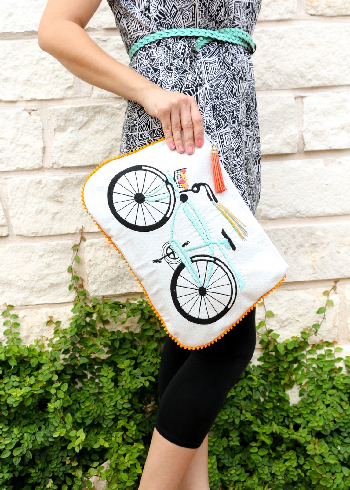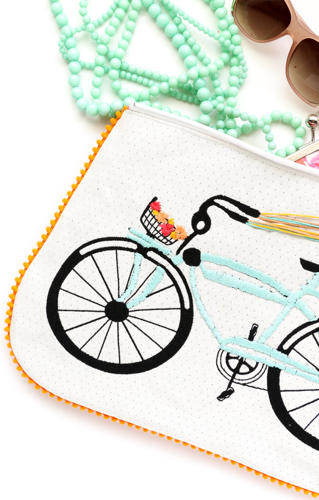 white bicycle print into the cutest embroidered clutch with pom pom trim just in time for summer.