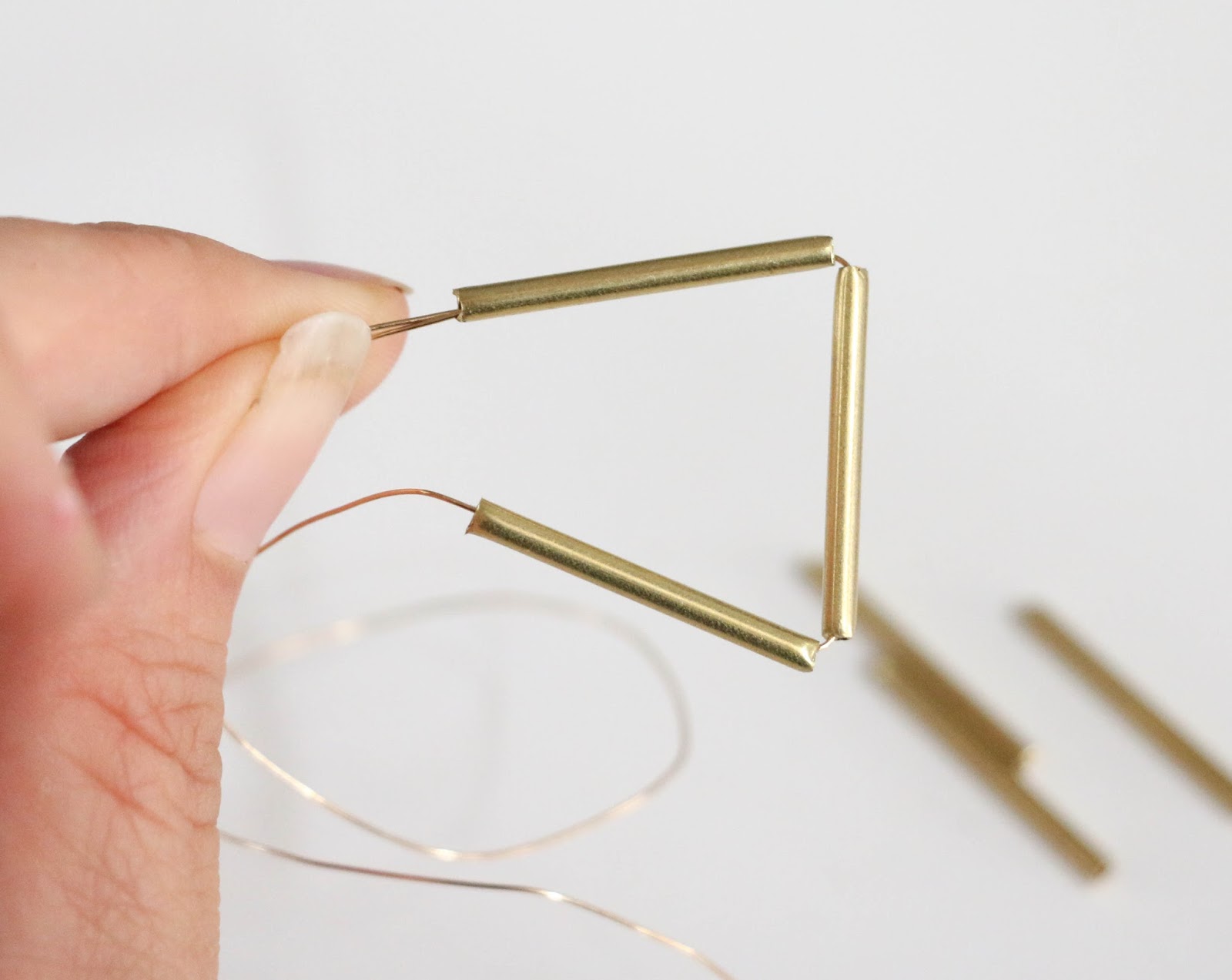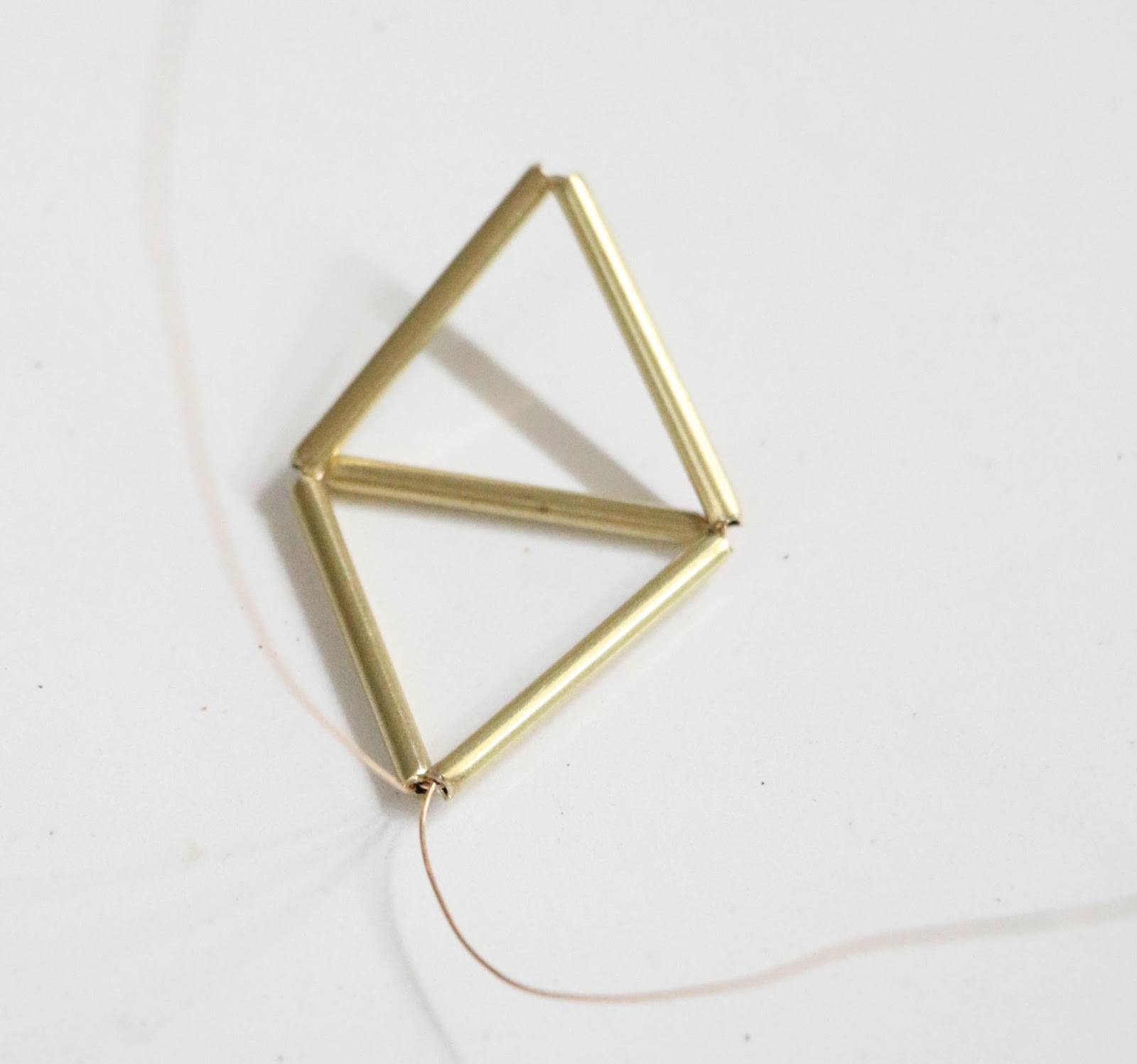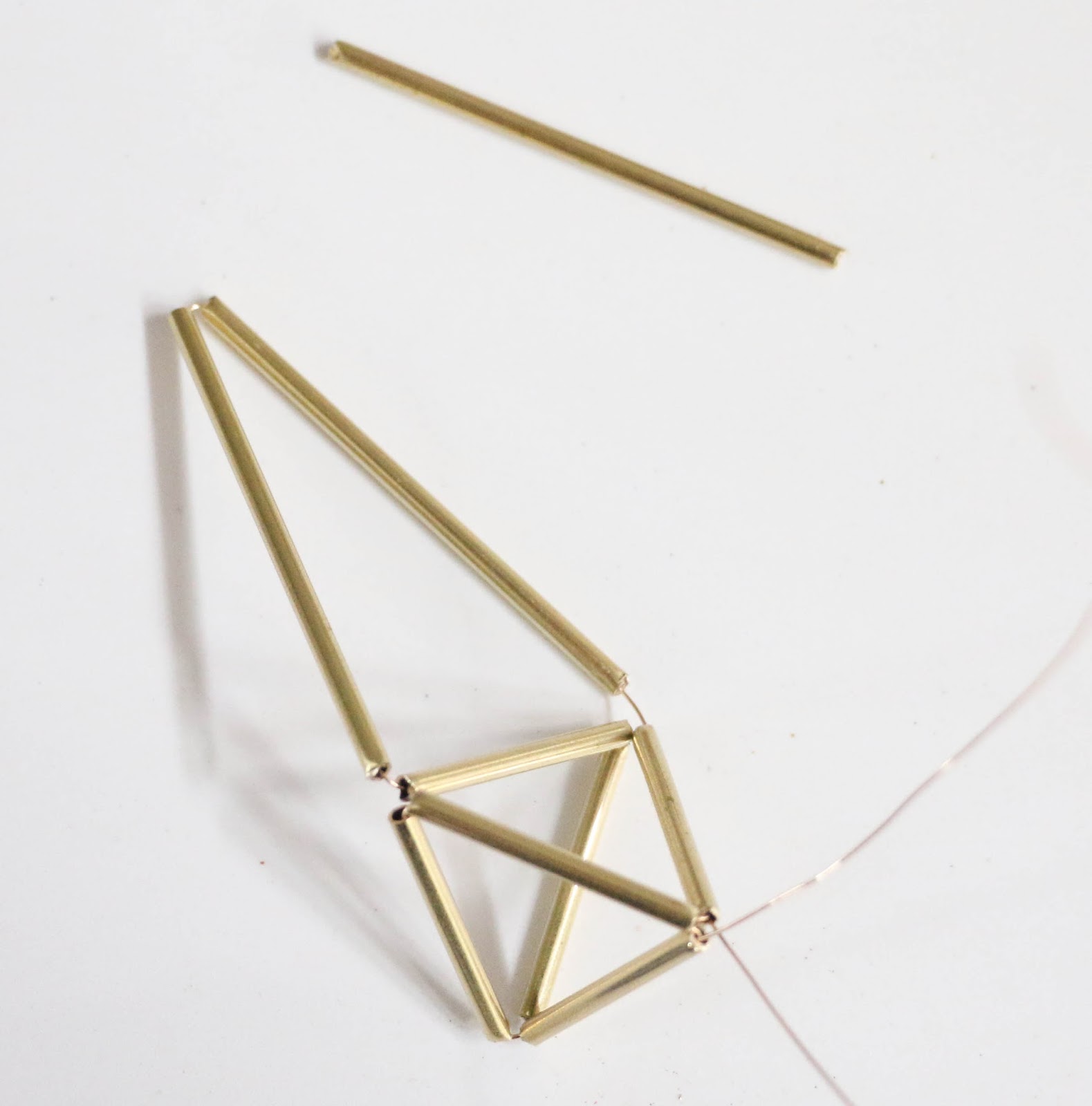Next two of the 1.5″ pieces get put on the wire and it then gets threaded through one adjacent side to create a longer triangle.