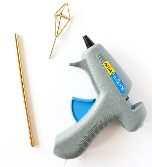 Now simply hot glue your himmeli piece into the top of one of the gold straws and you have your first stir stick. Repeat as many times as you need.