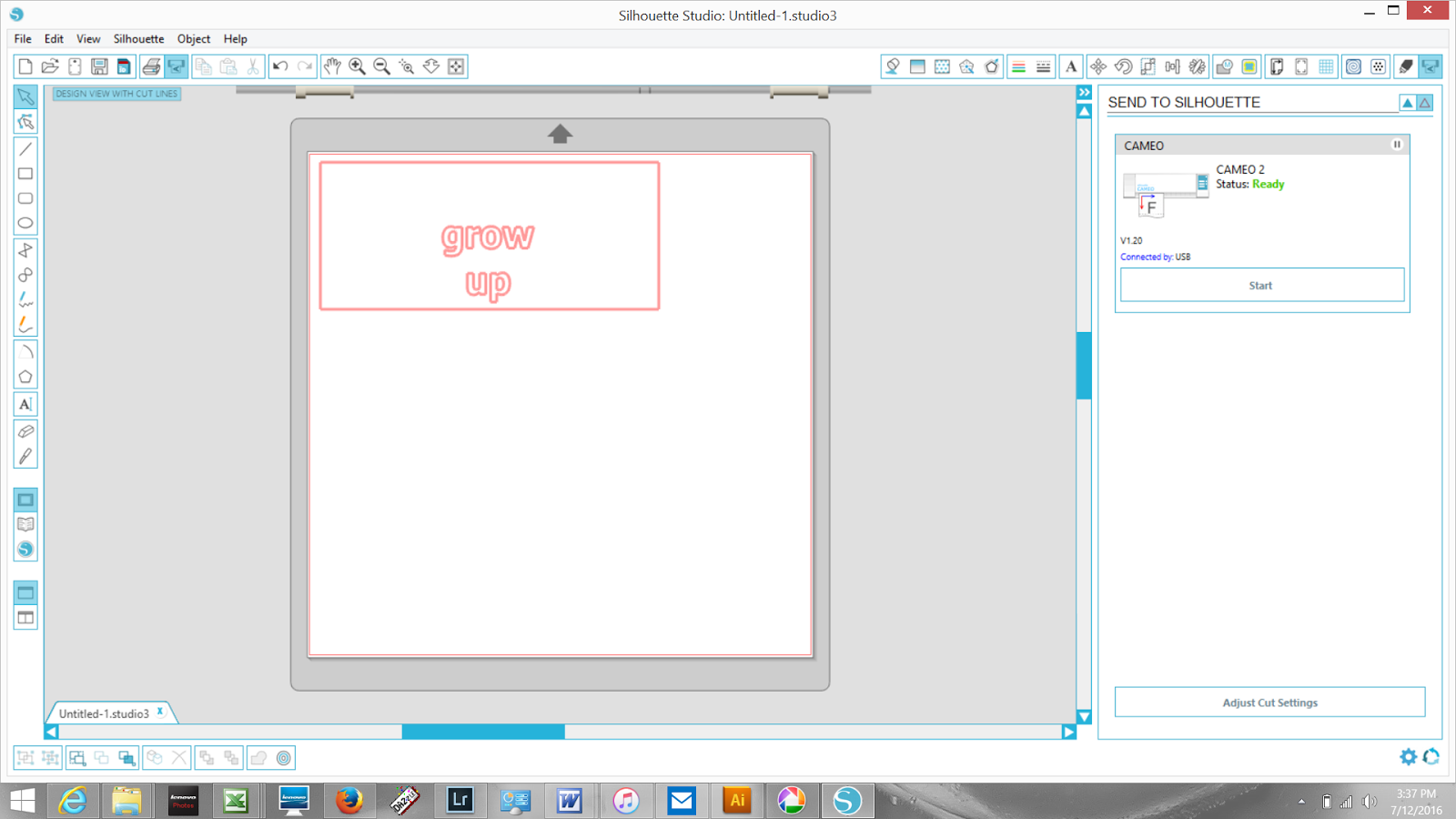 Begin by measuring the diameter of your glasses. Mine were 7.5″, so I created a 7.5″ by 3″ rectangle in the Silhouette Studio software. Pick out the word or phrase you want for my vase as well as the font and type it and center it in the middle of the rectangle towards the bottom. You want to make sure that the words will be able to be seen on the glass and not wrap too far around each side, so measure the length of the front of your glass and size the words to this measurement. Now it is time to load and cut your vinyl.
