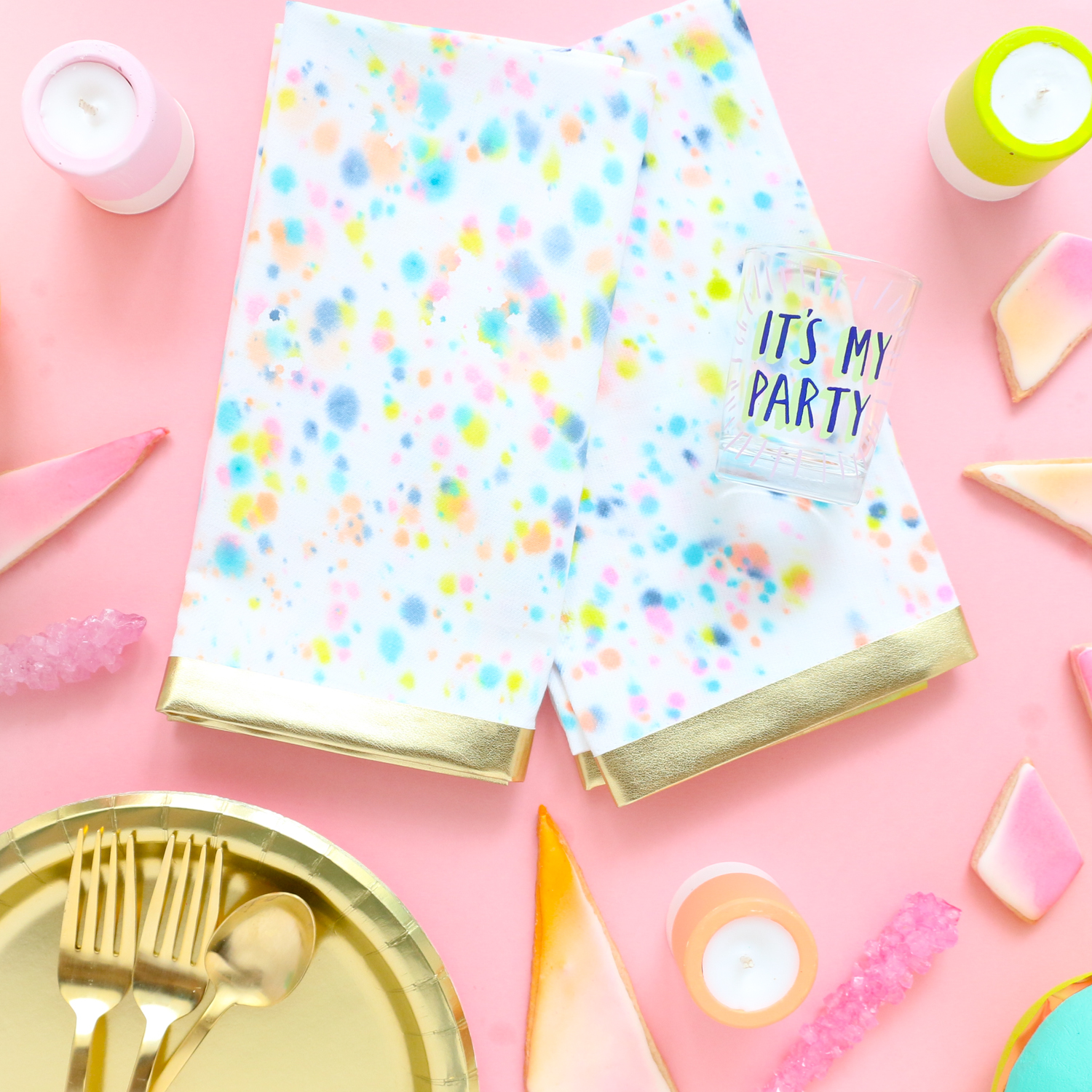Aren’t these watercolor polka dot napkins pretty? And really so simple if you use my super special secret method. I love the blurry watercolor dots and that gold trim is the perfect finishing touch. Follow along below for the details.