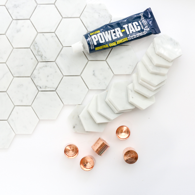 Once all your tiles are painted and have dried use a dab of hot glue (or industrial strength adhesive) to adhere the tiles together to form a tall hexagon tower. When your candle holders are as tall as you like, glue the copper end cap on the top marble tile piece and you’re done!