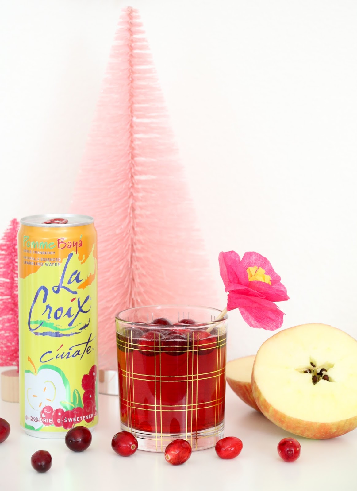 First up let’s talk about the star of any party. That would be the cocktails of course! I decided to work with two flavors of La Croix Curate, the pomme baya and the melon pomelo. The melon pomelo flavor was transformed into a tropical greyhound with the addition of a cantaloupe simple syrup, and the pomme baya was combined with vanilla simple syrup, cranberry juice, and bourbon for the tastiest holiday spritzer ever!