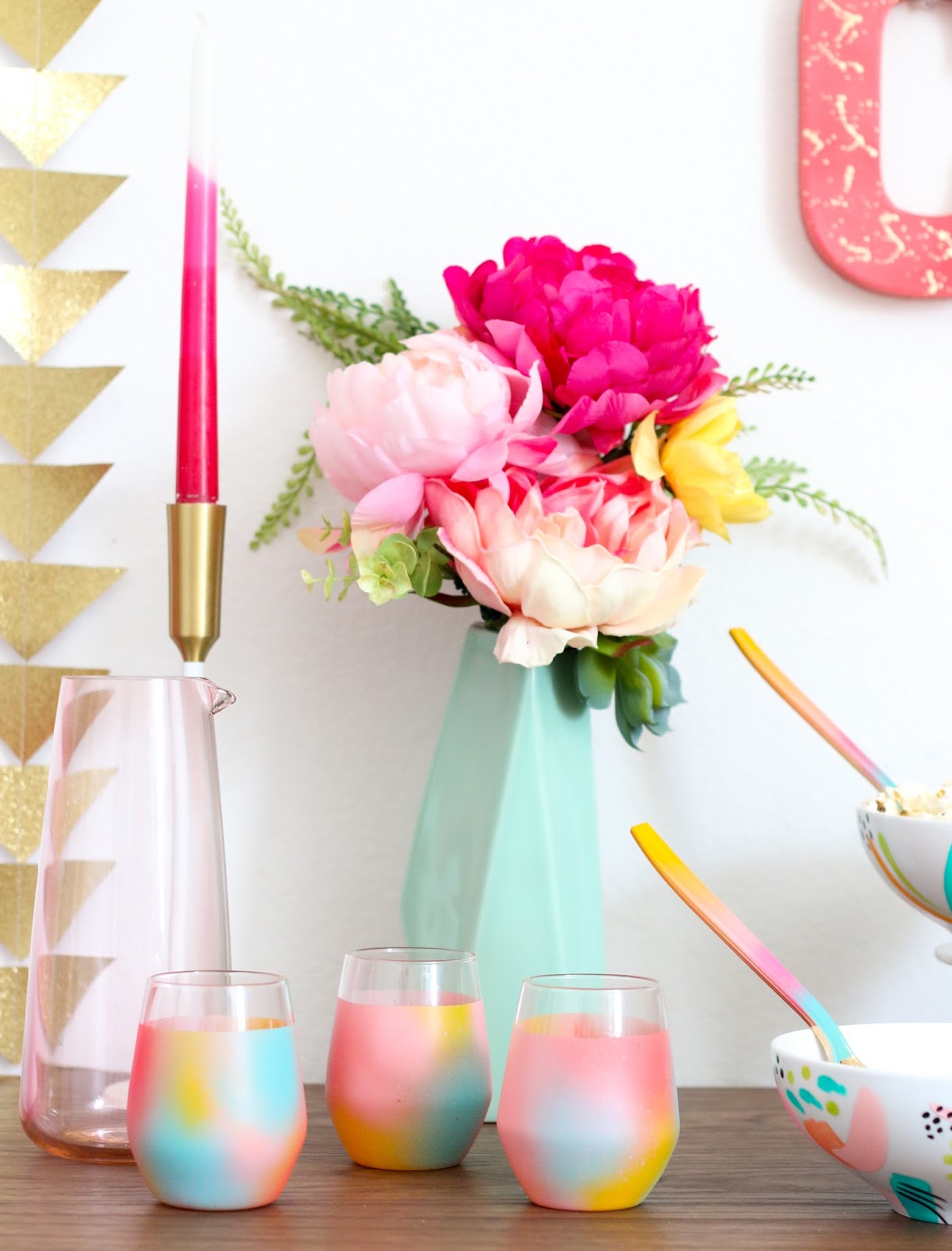To go along with my abstract art serving bowls, I created gradient serving spoons with just a bit of spray paint.To make your own cover the spoon portion with painter’s tape or washi tape and spray stripes of paint down the handle. Once dry, coat the handle with a bit of clear spray shellac to seal in the paint.