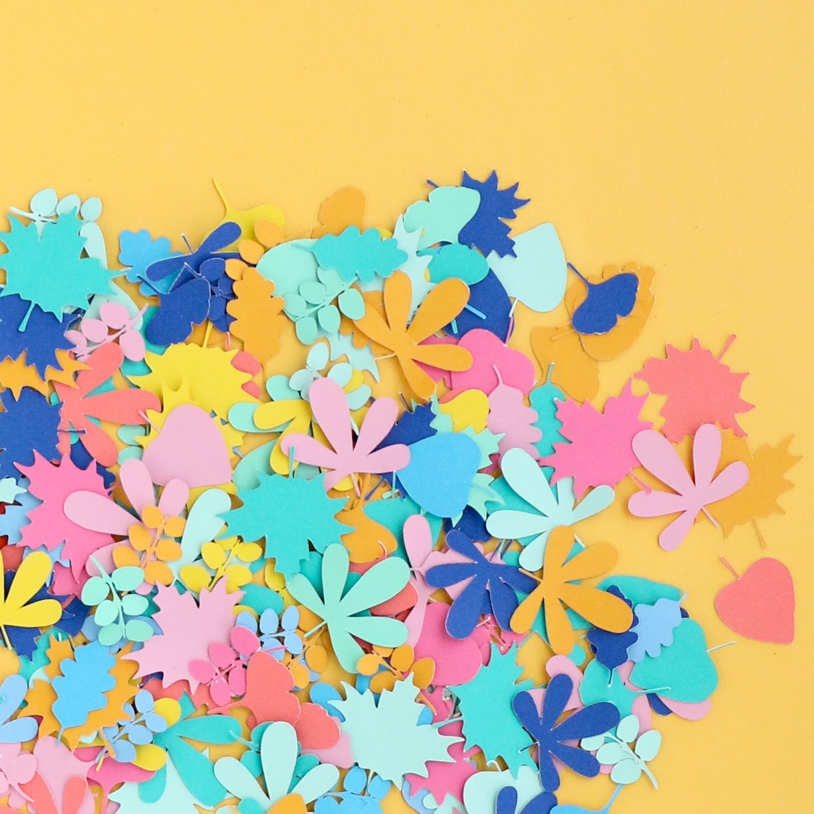 Basically all you need to do is upload the design to the Cricut design space, select simple design, then select cut file only. Then add the design to your canvas and scale it so that the confetti pieces measure about 3/4 of an inch. Next, add your card stock to the cutting mat, load it and cut out all the pretty leaf confetti.